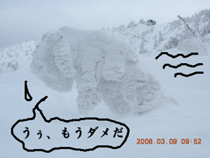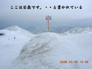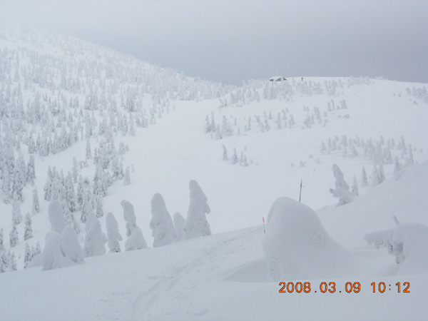 【記 録】 ■2008年3月9日/単独 ■アイテム:スキー ■食べた物:妹の手作りマーブルケーキ/カップヌードルミニ/:飲んだ物:スポーツドリンク300ml/コーヒー1杯 ■ 阿仁スキー場ゴンドラ終点 am9:10ーー 石森am09:50 ーー 避難小屋 am10:20 ーー 森吉山頂 am11:10ーー 避難小屋 pm12:10 <25分休憩>ーー ゴンドラ終点 pm13:05 |