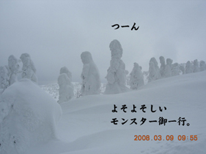 ゴンドラ終点の目の前から樹氷めぐりコースが整備されていました。かまくらなども設営されており何やら楽しそう。すでにここで1160m以上の標高だけあって、モコモコとしたモンスターがそこかしこに! |