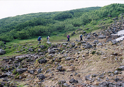 ↑↑康新道との分岐点。 数年前、妹と祓川口 初挑戦のときはここまでで引き返した。 と言うのも初心者丸出しの 我々が9時過ぎに登山口で 準備体操をしてたら 装備を見兼ねた山ヤさんが、 今からなら 八合目で引き返しなさいと 忠告してくれたから。