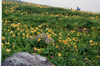 小浜小屋も近付くとニッコウキスゲが 目立ちはじめる。 小屋の裏手に回ると、はじめて見る大群落!