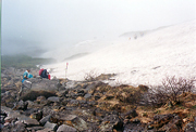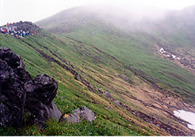 去年は鳥海山の残雪が少なかったけど 今年は例年なみにある方じゃないのかい? 六合目賽の河原で、結構濃いガスに見回れながらも 通い慣れた整備された道。 のんびり歩く。