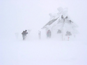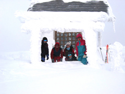 視界がばっと開けて 九合目田代湿原。 おお〜広い〜!感激も束の間。 あっというまに 吹雪いてきて真っ白に(>_<) いかにも雪山洗礼って 雰囲気があって なかなかよろしい。 九合目からはやや急な登り。 えっさえっさと 登るうち、大きな看板 (雪だらけ)が見えてくる。 この斜左奥が目当ての神社だ。