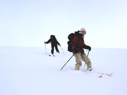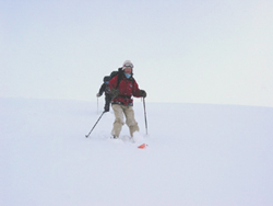いよいよスキーで滑降タイム。 まずはその前に記念撮影。 この頃には吹雪も止み、 すかっと太陽が輝いてました。 ホント山の天気ってきまぐれ。 スキーのシールを剥がして、 滑る準備に取りかかる。 15年振りのスキーにやや緊張。