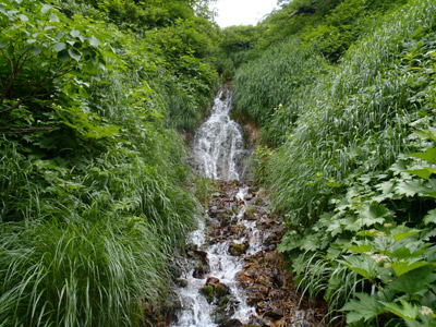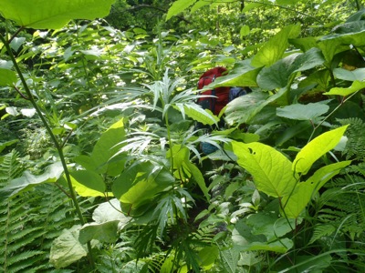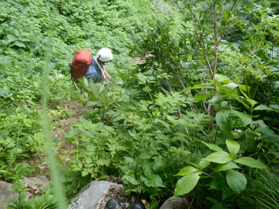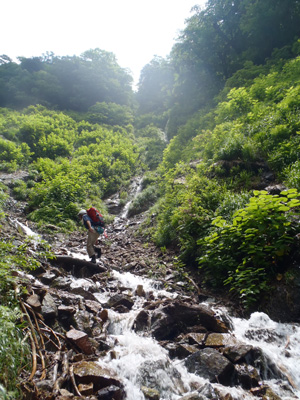 オオイタドリをかき分け、時には沢を徒渉して進むと