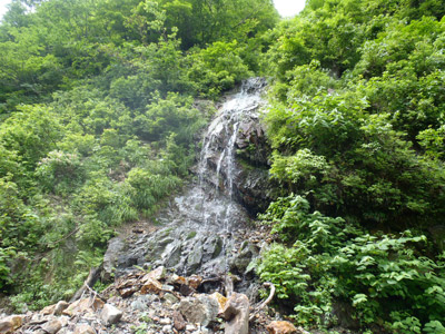 この滝は左側に巻き道。リッジ状の岩を越えて行くのだが