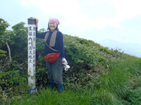13時7分。山頂到着。標柱と、そのそばに古い石に「朝日嶽」