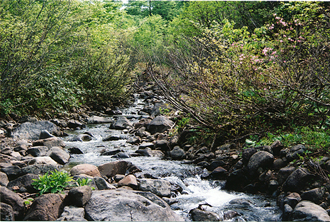 やがて、渓流が現れる。今日の旅は この川の源泉に辿ってゆくという余興付きだ。 川沿いには名前は知らないツツジみたいな花。 六合目の与治兵衛、七合目柳瀞と進むにつれ 水芭蕉がチラホラと見つかる。