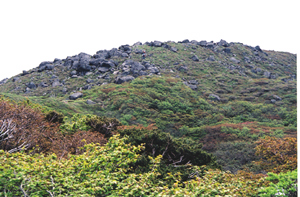 焼石岳山頂近くは岩がゴロゴロの道。あのあたりが九合目の 焼石神社。 ここまでくると、 ようやく他の登山者を ポツリポツリと見かけた。 尿前からの入山の方が 多いのかもしれない。