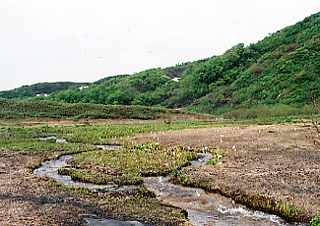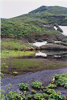 かつては牛の放牧場, 焼石沼に到着。 この小道のかわいらしいこと! ガイドブックには 「半野生化した牛には 近付かないこと」と かかれていたが、 数年前にもう放牧はなくなったみたい。 一度見たかった。