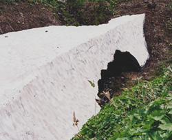 ほどなくして、また変なもの発見。 残雪、まるで人が手掛けたように きれいに片面が切れ落ちている。 なんで?なんで? 謎をかかえながら 山道を行く。