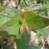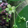 ニシキギ科。花が咲くのは初夏ではあるが、ごらんの通り緑色の小さい地味な花なので昆虫にはともかく 人間にはほぼスルーされている。それでも5枚の花びらの、均整の取れた小花が頭上にぷらぷらと揺れる様は何ともかわいらしく 私は好きだ。この植物はむしろ実のほうが花よりも華やかだ。赤い仮種皮が割れると、5個の朱色の種子がぶらんぶらんと垂れ下がる。 ツリバナは北海道から九州まで広く生育し、日本海側にはこれよりやや大振りのエゾツリバナがある。