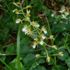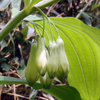 ユリ科。高さ80~130センチにもなる。こう書くとさぞや見上げるような大きな百合かと思えるが、実際はだいたいが葉と花、もしくは実の重みで 登山道脇に半ば行き倒れている。釣鐘状の花は、きれいに開花する頃はかなり重くなっているうえに梅雨どきであったりするので雨の重みでますます頭を垂れ、 なかなか見る機会がない。てっきり花の先はすぼんだままだとすら思っていたが今年、行き倒れているオオナルコユリを起こしてみると、なんと、かわいらしく花びらが開いていた。7月も下旬になると花から緑色の実となり、夏の終わり頃までには黒く熟しはじめる。
